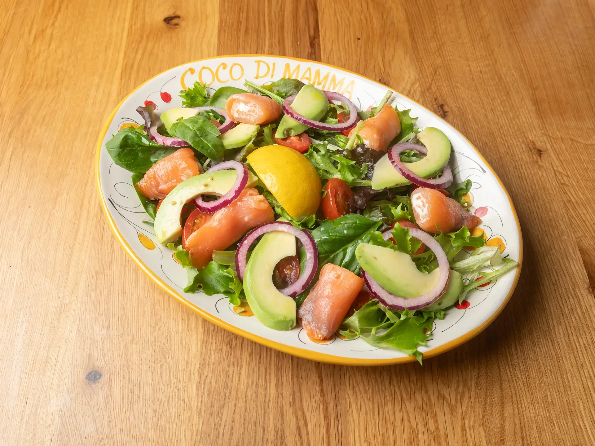 | Salade, roulés de saumon au fromage frais, avocat, tomates, oignons rouges | |