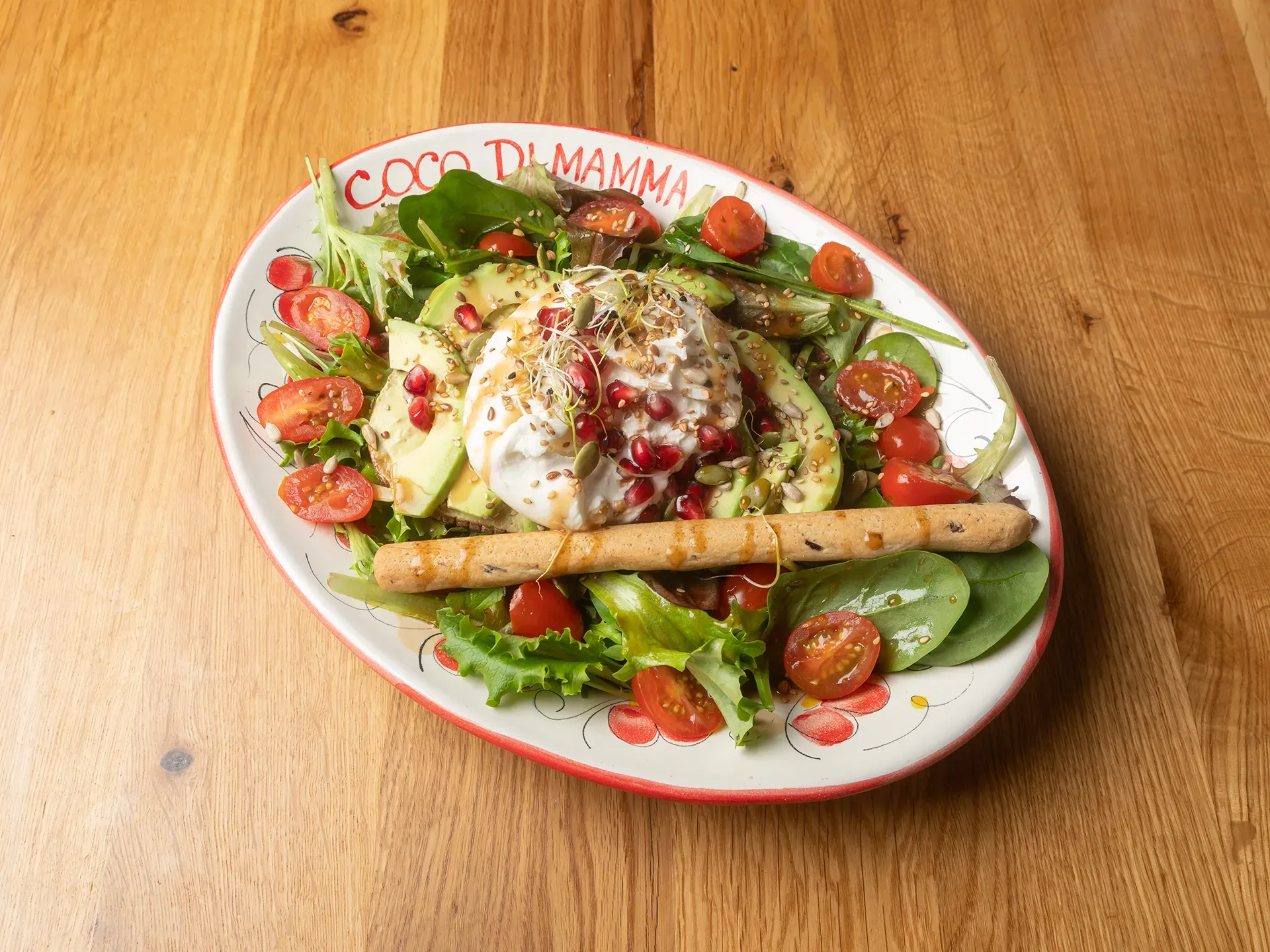 | Salade, tomates, toast cream cheese avocat, burratta, grenade |